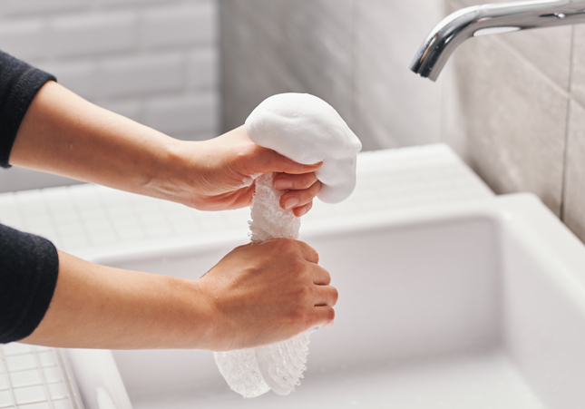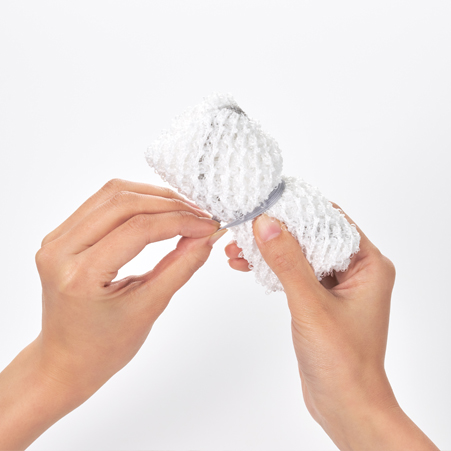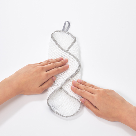 繊維と繊維の間に空間をもたせ、たっぷりの空気を含ませることで、まるで泡だけで洗っているかのような泡立ちを実現しました。独自の繊維構成による、ふわふわの優しさと、少しシャリッとするさっぱりさ。優しく洗いたい人、しっかり洗いたい人、子どもから大人まで納得して使える ボディウォッシュタオルができました。