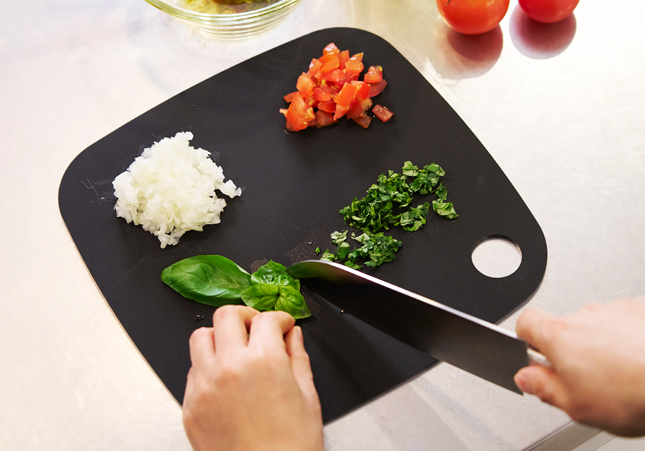 一辺25cm。狭いスペースでも回して使え、みじん切りや複数の食材を1つの面で切るのに便利です。