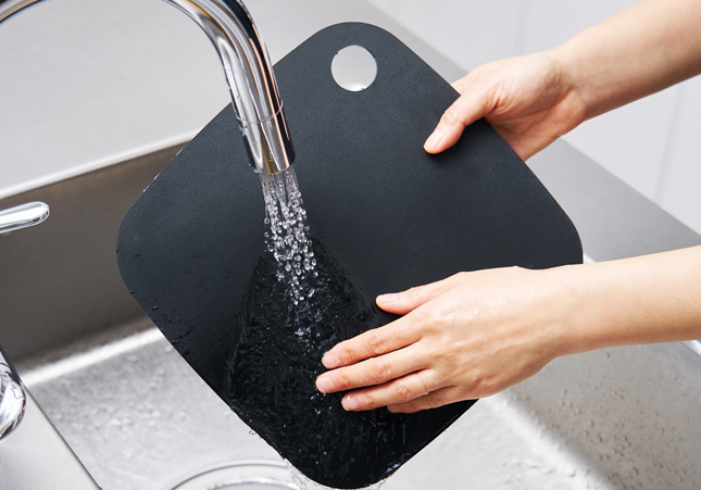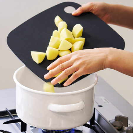 四角と丸の中間であるスーパー楕円をモチーフとしたカッティングマットです。狭いスペースでも回しながら使うことで、切る量や食材の大きさに合わせて幅広く活躍します。特殊な3層構造で刃あたりもよく、お皿のような感覚で手軽に洗えます。