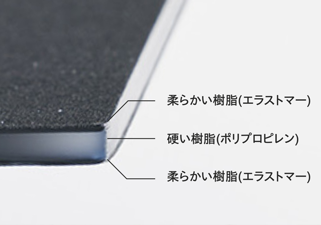 硬い樹脂を柔らかい樹脂で挟んだ特殊な3層構造は、刃あたりの良い3mm厚。