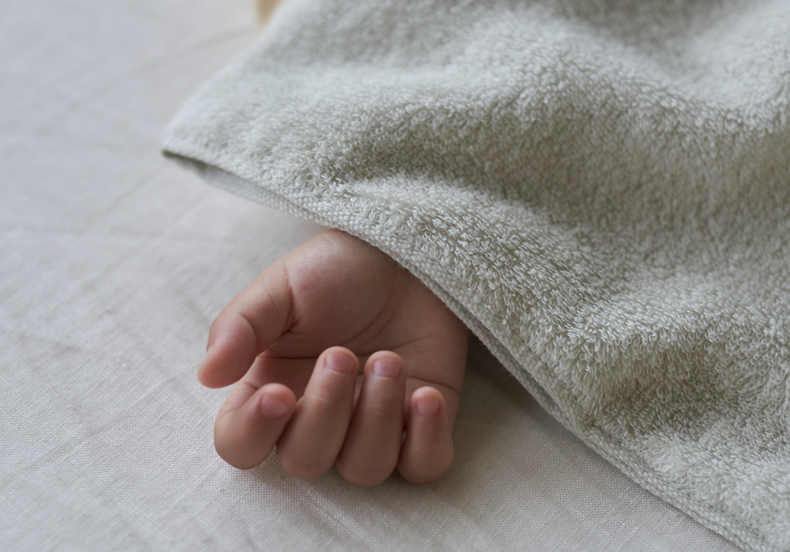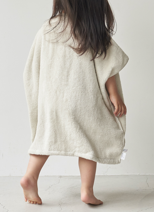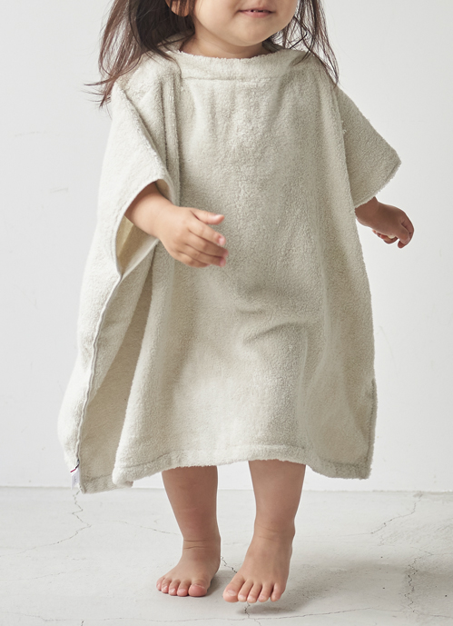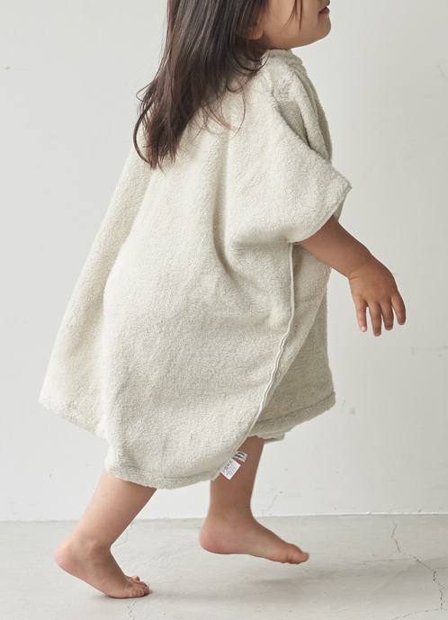 h tag bath towelのユーザーの声から生まれた製品です。さっと身体を拭いた後、頭からバサッと着せてあげる。元気に動きまわる子どもたちのお風呂上りを快適にするためにデザインされました。首元のホックは成長に合わせて3段階で使用することができます。